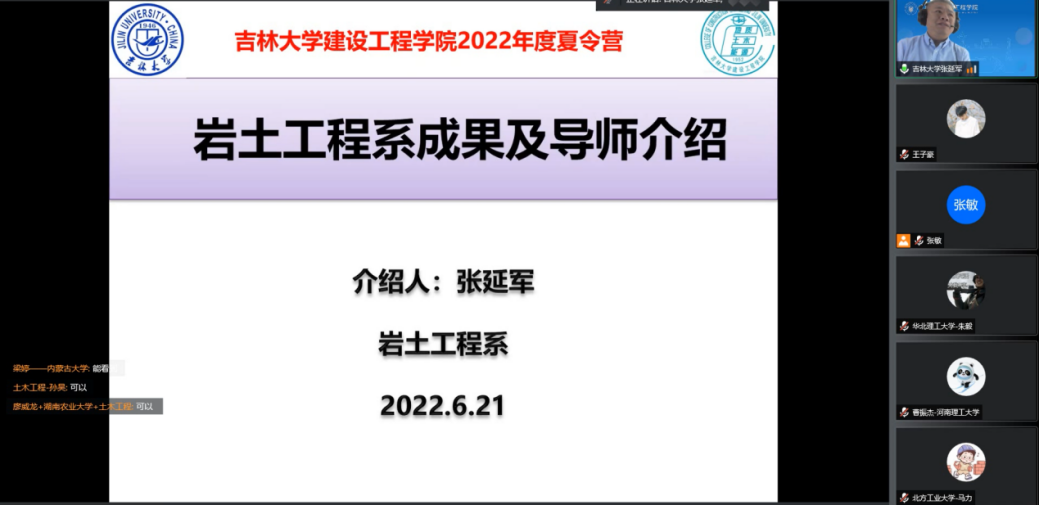 6月21日下午,学院在线举办了地质工程学术论坛和土木工程学术论坛,学院地质工程专业、土木工程专业八位专家教授分别为营员同学们做了精彩的学术报告,与营员们在线上展开热烈讨论。