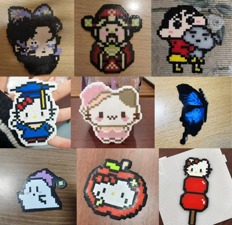活动伊始,主持人以亲切开场拉近与现场同学的距离,详细讲解拼豆制作基本流程及熨烫安全注意事项,并现场演示精准摆豆、边角处理等实用技巧。活动展示的参考图案风格多元,涵盖可爱卡通形象、简约文字标语、治愈系风景及个性符号等,丰富的创意案例迅速点燃大家的创作热情,即便无相关经验的 “新手” 也纷纷拿起拼豆,着手构思专属作品。