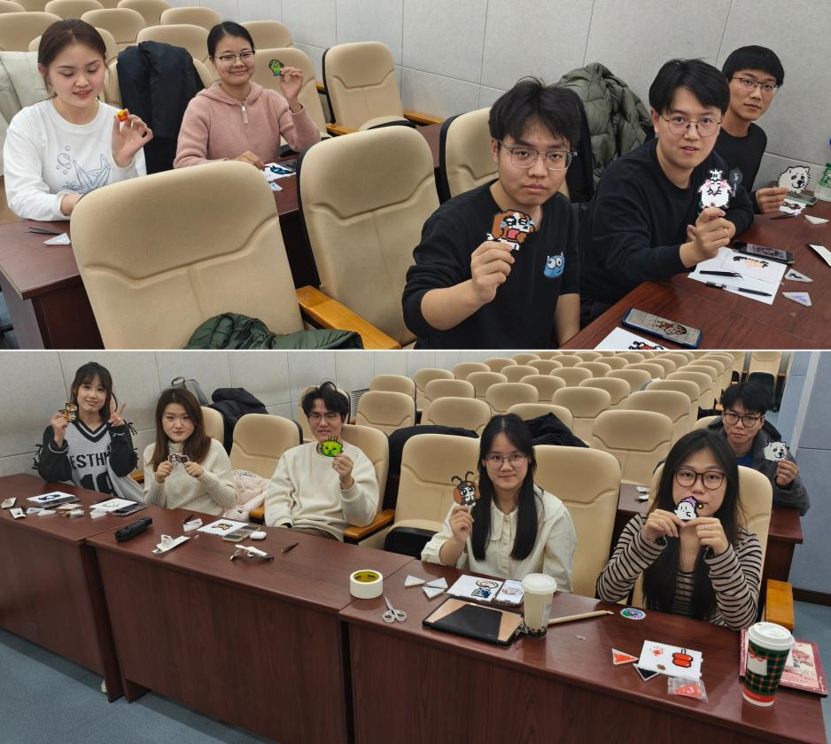 同学们在创作的轻松氛围中拉近彼此距离,暂时忘却论文、实验带来的压力,沉浸于手工活动带来的平静与满足。当最后一颗拼豆摆放到位、作品完成熨烫定型,大家脸上均洋溢着满满的成就感,不少同学主动拿起作品与身边人分享,现场氛围温馨治愈。活动尾声,全体参与者手持成品合影留念,定格这段专属的解压时光。