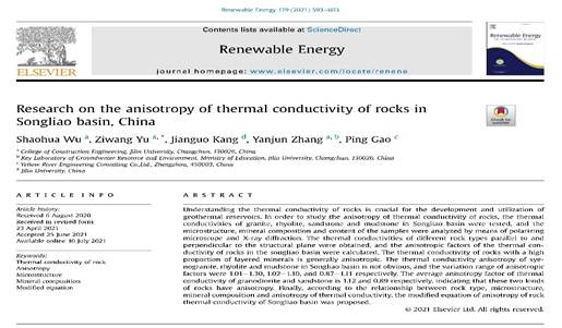 2021年7月,yl23455永利集团于子望副教授团队,在国际著名学术刊物《Renewable Energy》上发表题目为“Research on the anisotropy of thermal conductivity of rocks in Songliao basin, China”的论文,针对松辽盆地岩导热系数各向异性特征进行了研究,对于研究区地热能开发具有重要意义。