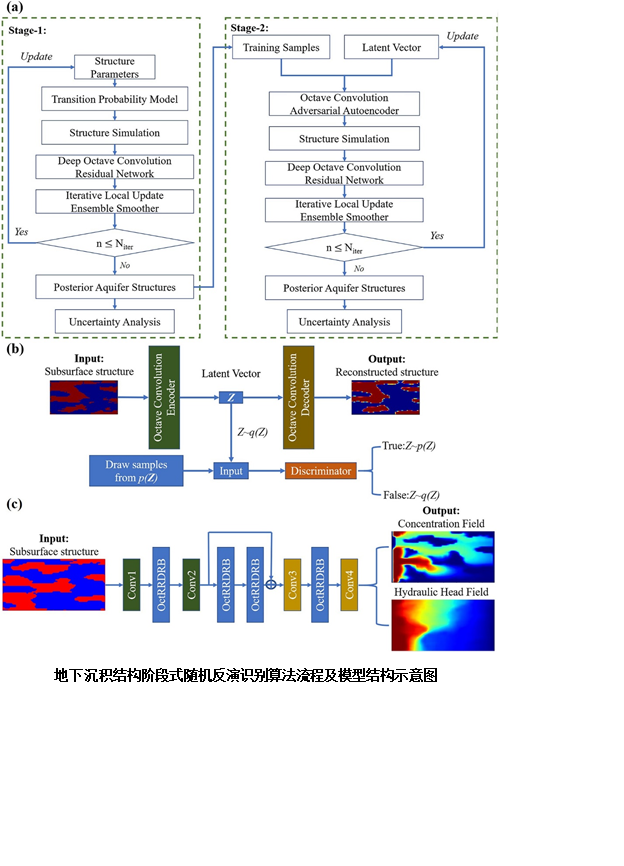 准确的地下水水流及溶质运移模拟依赖于含水层岩相结构的准确刻画。基于地质统计的随机模型是目前最为常用的方法之一,但是由于钻孔分布较为稀疏,其识别得到的含水层岩相结构往往具有很大的不确定性。为了提高含水层结构刻画的准确性,并充分利用丰富的间接观测数据(如水头、浓度、温度数据),本研究以沉积岩相结构特征为指引,以场地监测数据为依据,引入对抗学习、图像回归、图像识别等深度学习理论与技术,提出了一种基于知识学习、数据融合和智能技术共同驱动的含水层岩相结构识别算法,以建立适合不同场地污染特征的高精度含水层非均质模型。