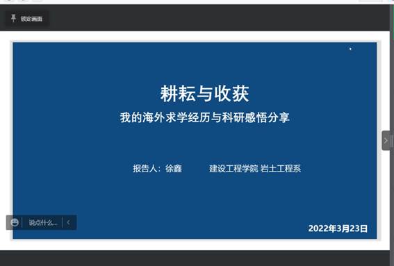 系列讲座第一期于3月23日19:00通过腾讯会议线上召开,主讲嘉宾是学院岩土工程系博士生导师徐鑫副教授,主题为《耕耘与收获——我的海外求学经历与科研感悟分享》。讲座由学院副院长王伯昕主持,执行院长郭威发表了热情洋溢的讲话,各专业教师、学院本科生、研究生近150人在线参加讲座。