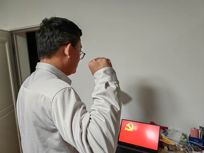 随后,支部全体党员面对党旗,高举右拳,重温了入党誓词,在誓词中回顾自己入党时的初心,确立自己在抗疫斗争中的使命,作为学院的机关党支部,作为学院各项工作的保障团,一旦抗疫工作有需要,支部党员定会如同入党誓词所说的那样,积极投身到各项工作当中去。