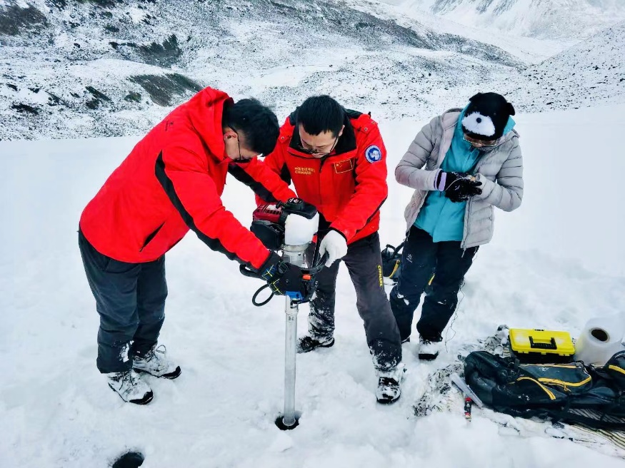 三名师生在天山河源1号冰川进行冰芯采样
