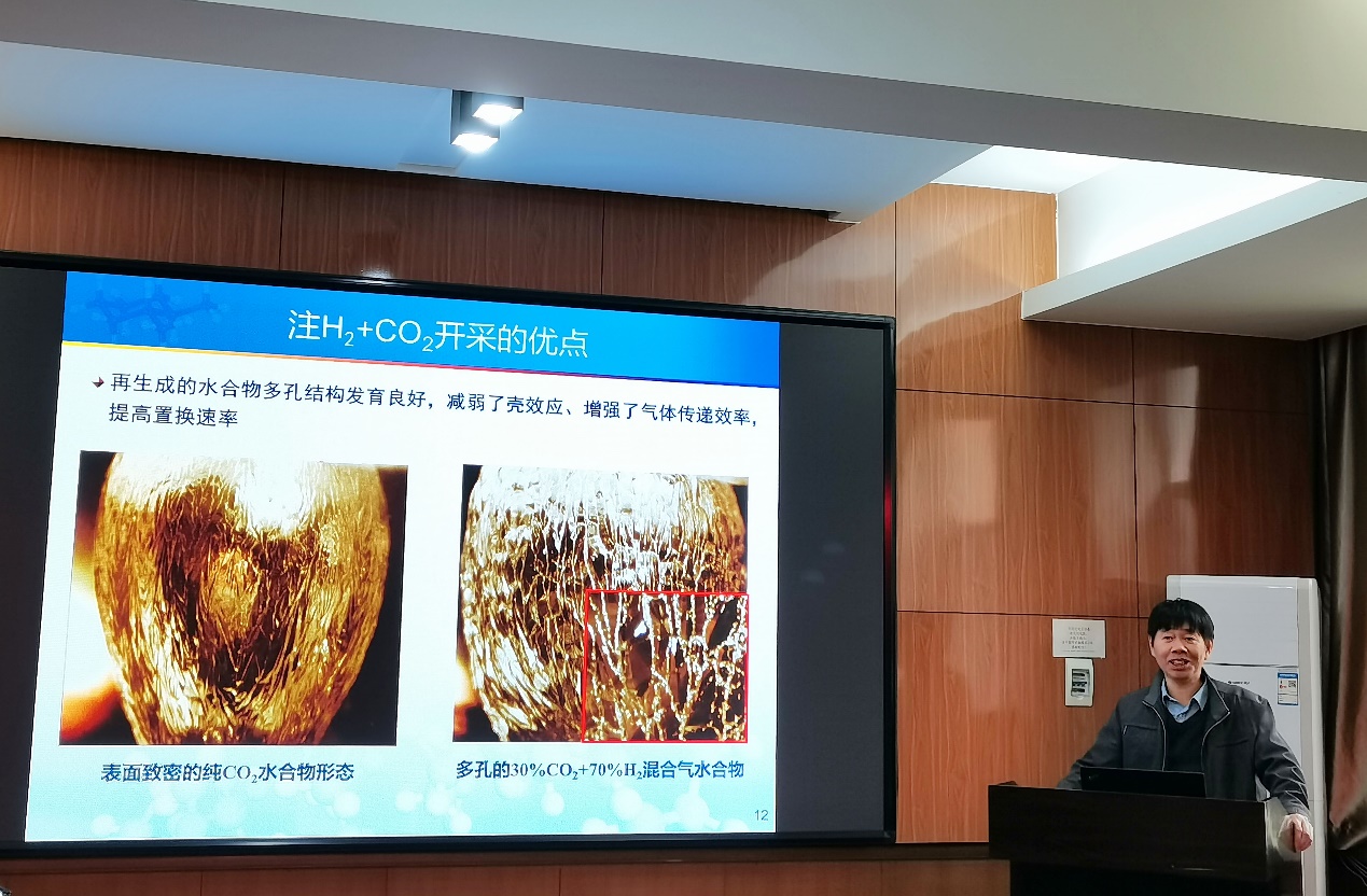 陈光进教授做“海洋能源资源与碳封存协同开发利用”的专题学术报告,分析了天然气水合物开发技术的瓶颈问题,提出了天然气水合物开发与碳封存的协同模式,阐述了注气开采甲烷水合物耦合制氢和碳封存技术思想,并介绍了中国石油大学(北京)气体水合物课题组相关研究进展。报告结束后,陈光进教授与现场师生互动热烈,师生们踊跃提问,陈教授认真耐心解答。陈光进教授的报告为天然气水合物与碳封存研究打开了一扇窗,激发了相关师生面向双碳目标开展海洋油气开发研究的热情,为未来科研合作奠定了基础。
