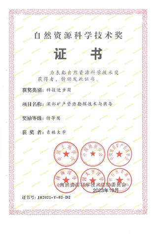 近日,自然资源部发布《2022年度自然资源科学技术奖获奖成果公告》,我校作为第二单位完成的“深部矿产资源勘探技术与装备”成果获自然资源科学技术奖特等奖,yl23455永利集团张晓培教授、牛建军教授分别为第二完成人和第七完成人,中国地质科学院矿产资源研究所为成果牵头单位。