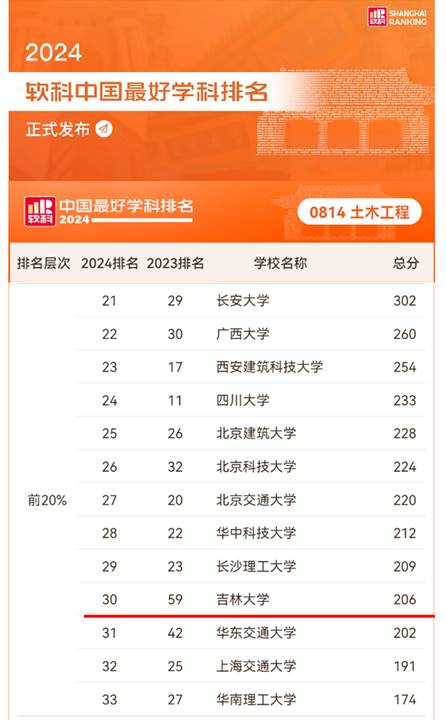 2024年10月15日,高等教育评价专业机构软科正式发布“2024软科中国最好学科排名”。我校土木工程学科由2023年的第59位跃升至第30位,进入全国前20%排名层次,是全国84个前50%排名层次学校中进步最快的大学。
