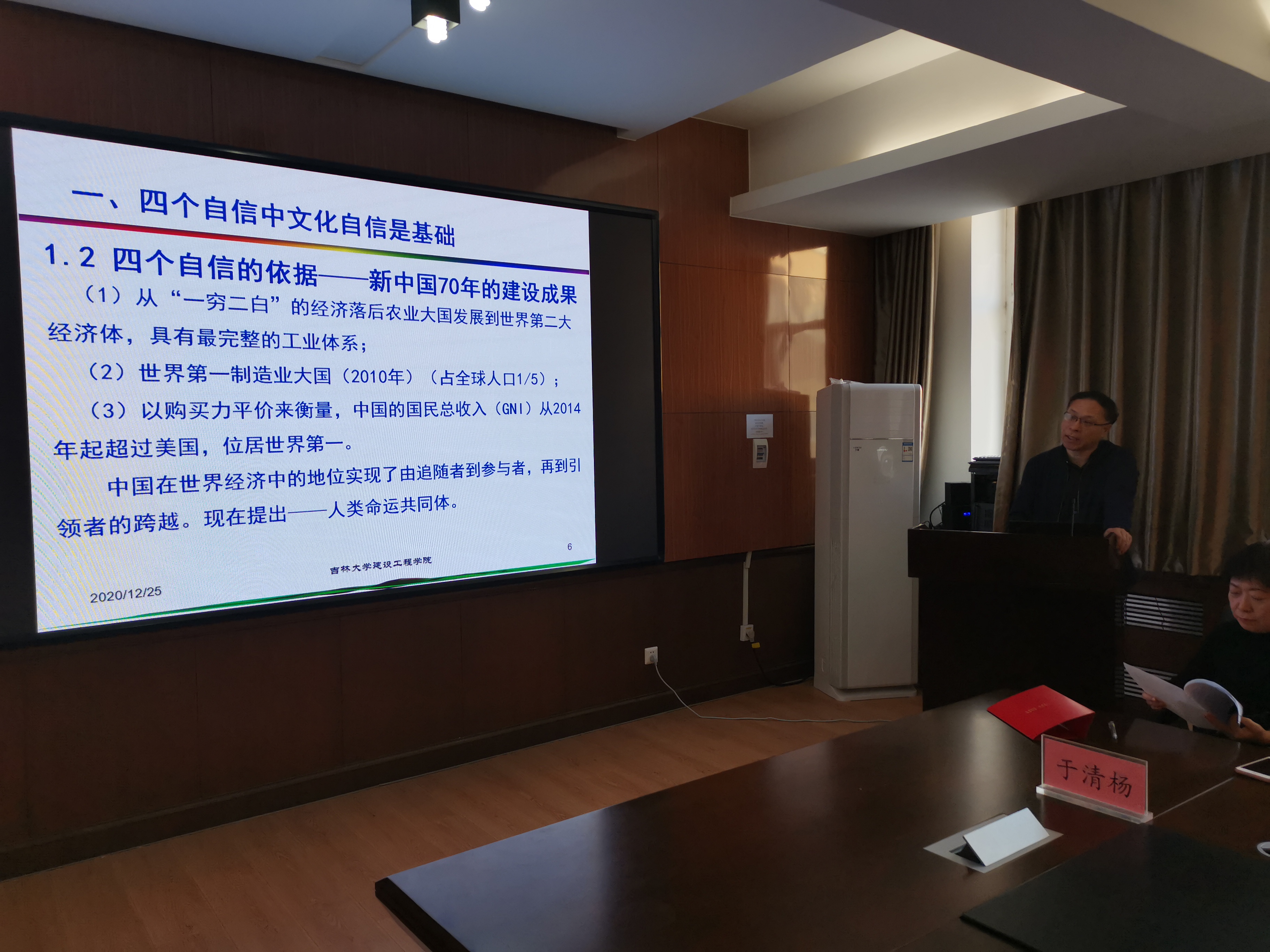 会议首先由yl23455永利集团副院长陈晨作为联系支部院领导为支部全体党员上了名为《四个自信·双一流·与时俱进》的党课。陈晨副院长深入浅出,结合新中国的发展史为大家阐述了“四个自信”在“双一流”建设中的重要性。