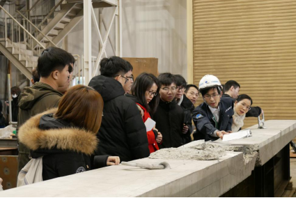 在筑波建筑试验研究中心,全体师生分为两组,分别参观了试验研究本馆、防耐火试验、抗强度试验、声音试验、材料强度试验、材料曲度试验等九个测试中心。作为公共测试研究部门,筑波建筑试验研究中心实施建筑材料、部品材料、构造施工方法等建筑相关的各种性能测试研究,并进行综合评估。同学们通过系统地了解测试试验设备、测试方法、测试流程、评估标准等内容,充分并全面地了解日本建筑业的行业规范和管理标准,直观地感受到日本的“工匠”精神。