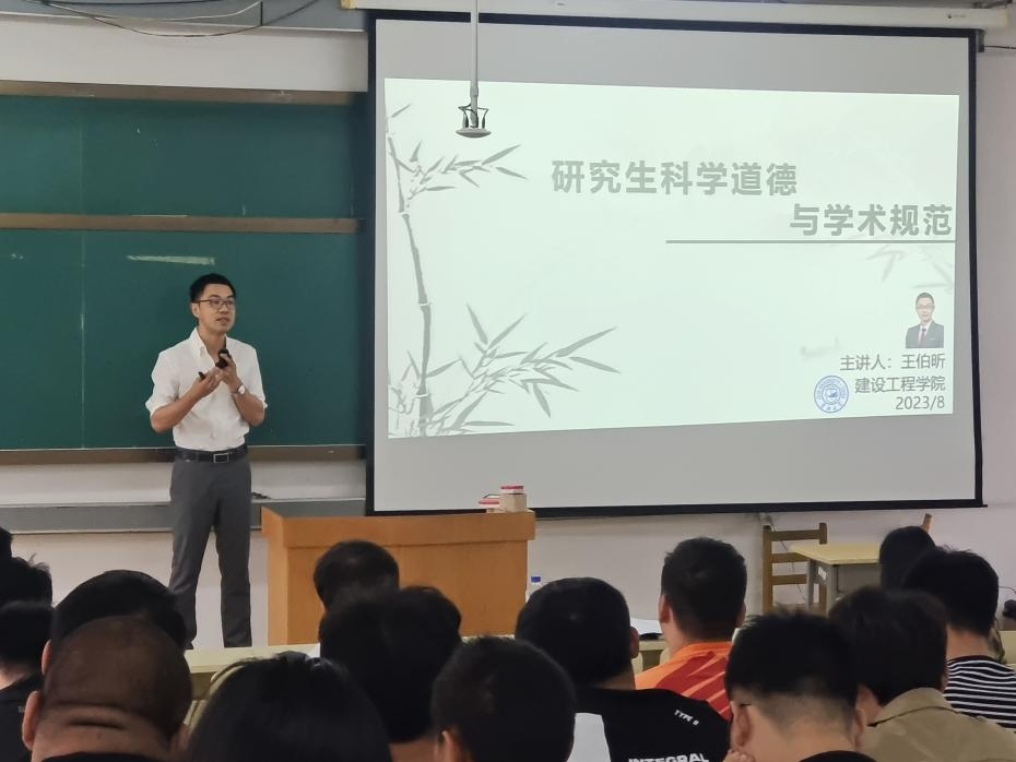 副院长王伯昕为2023级研究生新同学开展了《科学道德与学术规范》讲座。王院长阐述学术不端的定义、列举了我校规定的学术不端行为、近年来国内学术不端案例、介绍了我校关于学术不端的处罚。王院长一一列举了学术活动中须严格遵守的规范及规定,表达了对建工学子学有所成的殷切期望,嘱咐同学们不仅要在科研道路上恪守学术道德底线,更要在平时的生活中树立正确的人生观、价值观。