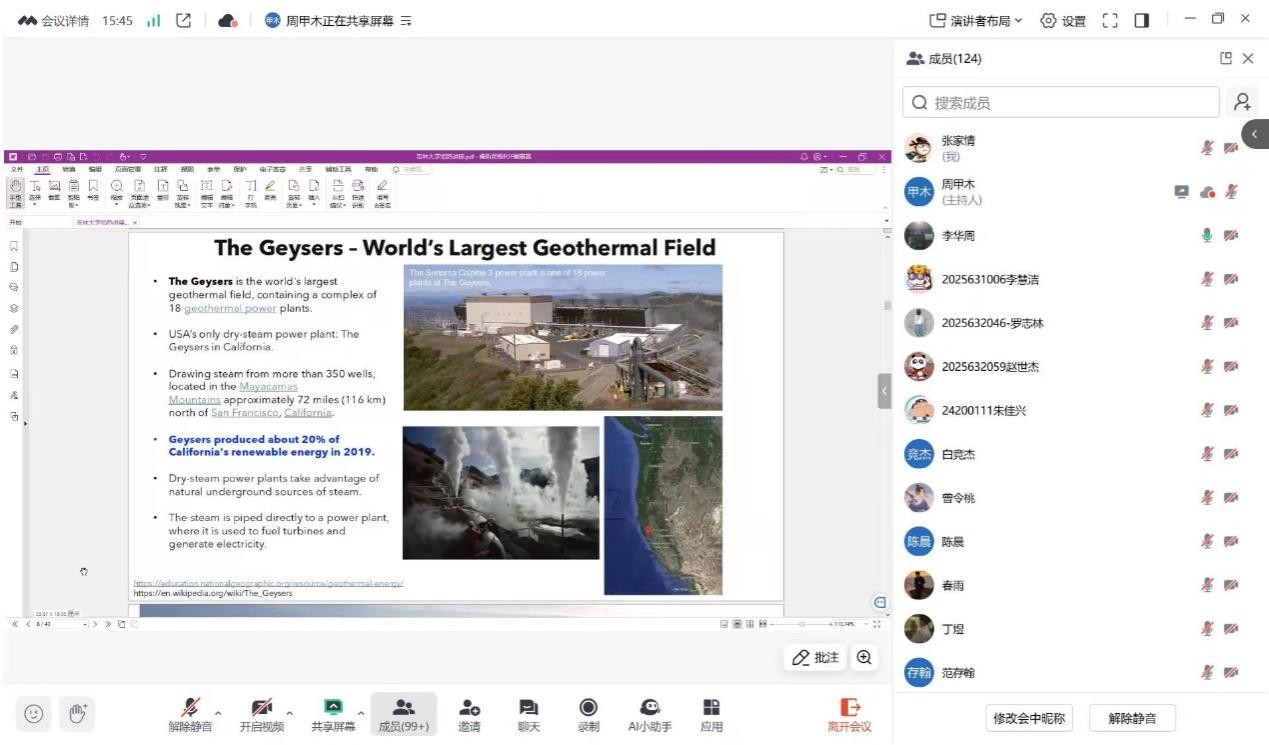 讲座中,Li教授围绕“地热资源”与“地热电站”两大板块展开,结合能源需求现状,将地热定位为可缓解产业压力的“地球内部清洁能源”;并系统对比了干蒸汽、闪蒸蒸汽、有机朗肯循环(ORC)等主流发电技术,并分享了加拿大阿尔伯塔省“Swan Hills”项目案例——运用ORC技术回收地热流体热量,结合天然气涡轮发电,实现21兆瓦装机容量与年减3.1万吨温室气体排放的有关情况。讲座既梳理了地热能源的基础理论与技术体系,也展现了该领域前沿应用与产业前景,为师生专业学习、科研方向选择提供启发,同时为学院能源工程、地质资源开发等方向的学科建设与国际合作搭建桥梁。