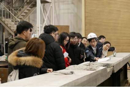 在土木研究所,工作人员首先介绍了研究所的历史发展、研究领域、在研项目和创新成果等概况。日本路桥的数量从1960年开始迅速增长,这些路桥结构承受着沉重的交通负荷,在严峻的环境和地震条件影响下如何保证其安全性是非常关键的。土木研究所下属桥梁与结构研究小组是进行公路桥梁的维护,防灾减灾以及设计和施工方法研究的机构。重点研究路桥检查技术、结构状态评估方法以及桥梁修复和加固方法,并进行日本公路桥梁规范的制定与修订。随后,全体师生参观了土木研究所土木工程实验室,重点观摩了载荷试验、新型材料代替钢筋(钢绞线)的预应力梁实验以及混凝土风化特性的相关试验。同学们对利用30MN大型压力实验机正在做的公路桥梁整体结构载荷试验、混凝土风化特性实验以及钢桥节点力学性能实验等都非常感兴趣,大家就实验设计、实验步骤、结构破坏特征等很多关心的问题与工程师进行了深入的交流讨论。开扩了眼界、拓宽了视野,尤其他们基于性能的规范要求和可靠性设计概念对于同学们今后学习和科学研究是十分具有借鉴意义的。